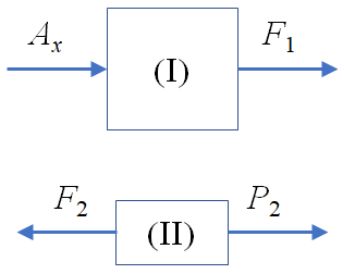 \begin{align} \sigma_I &= \frac{F_1}{A_1} = \frac{P_2-P_1}{A_1} \\\\ \sigma_{II} &= \frac{F_2}{A_2} = \frac{P_2}{A_2} \end{align}