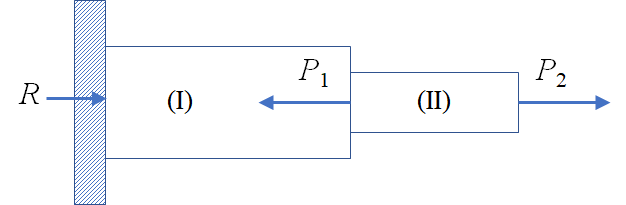 다음과 같은 계단식 구조물(stepped bar)에서 부재에 작용하는 응력을 구해보자. 계단식 바는 두 개의 부재로 이루어져 있고 왼쪽 편에 고정 지지되어 있다. 1번 부재에 $P_1$이, 2번 부재에는 $P_2$ 하중이 작용하고 있다. 각 부재의 단면적은 $A_1, A_2$이다.
