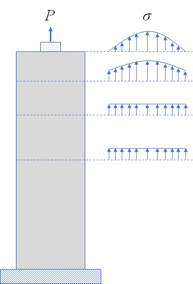 어떤 물체(body)의 표면에 외력 $P$가 작용하고 있다고 하자. 하중 $P$가 작용하고 있는 표면에서는 하중점에서 큰 응력이 나타날 것이다. 그러나 이 단면 치수 이상 멀리 떨어진 위치에서는 거의 균일한 응력이 나타나게 된다. 이것이 생브낭의 원리이다.
