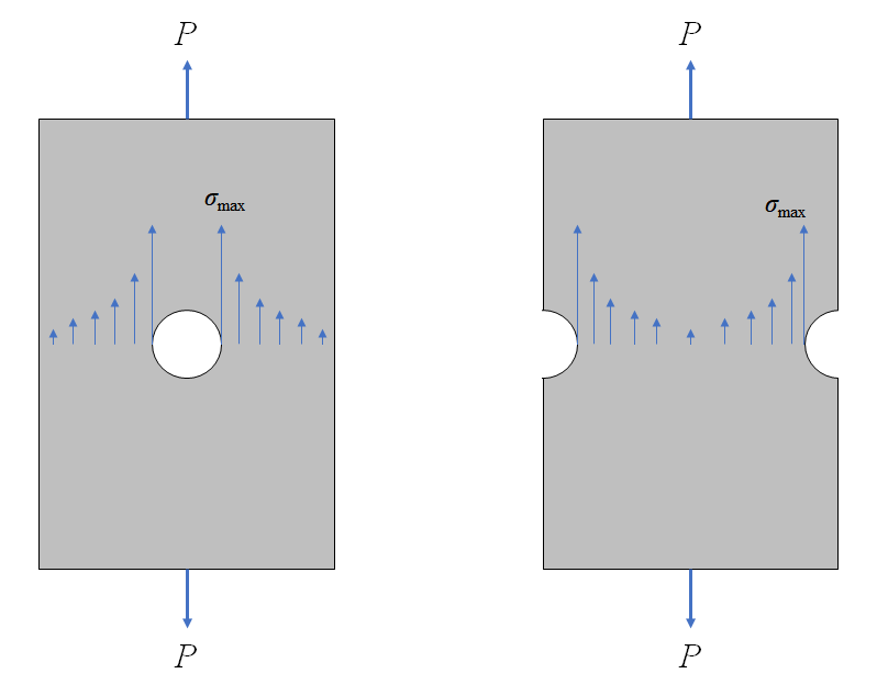 그러나 그림 1처럼 집중 하중이 작용하는 경우 하중점에서는 평균 응력보다 훨씬 큰 응력이 발생하게 된다. 이것을 응력 집중이라고 한다. 이처럼 응력 집중이 나타나는 경우는 크게 두 가지가 있다.