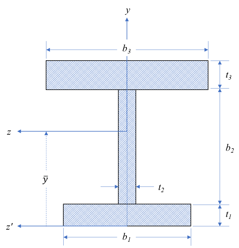 아래 그림 2와 같이 복잡한 형태를 갖는 형강의 단면 2차 모멘트를 구해보자. 실제 구조재로 자주 쓰이는 형태이다. 우리는 사각형 형상에 대한 단면 2차 모멘트를 이미 알고 있으므로 형강을 사각형 세 개로 쪼개서 생각하면 편리하다.