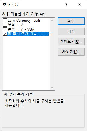 1.3. [추가 기능] 창에서 "해 찾기 추가 기능" 체크 후 [확인] 클릭