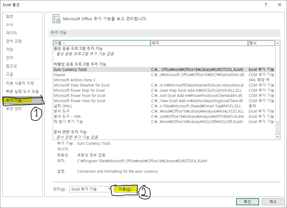 1.2. [Excel 옵션]창에서 [추가 기능] 메뉴 선택 후 [이동] 버튼 클릭