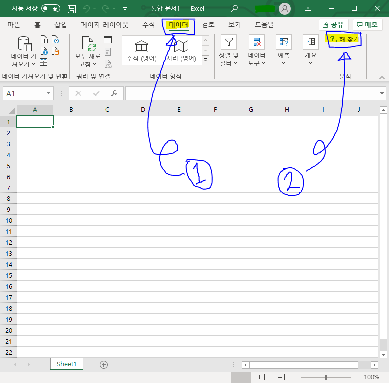 2.1. [데이터]탭 클릭 후 [해 찾기] 클릭