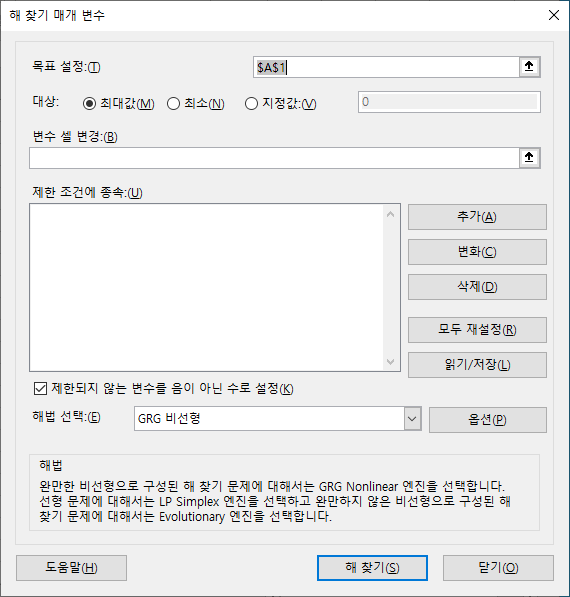 기본적으로 GRG(Generalized Reduced Gradient) 비선형을 사용하고 웬만한 문제는 잘 수렴한다. 단순 선형 문제는 LP(Linear Program) Simplex를 이용하면 빠른 수렴이 가능하겠지만 아주 규모가 큰 문제가 아니라면 GRG를 써도 무방하다. 아주 비선형성이 큰 문제는 Evolutionary algorithm을 이용할 수 있겠지만 속도가 워낙 느려서 일반적으로 사용하기 어렵다.