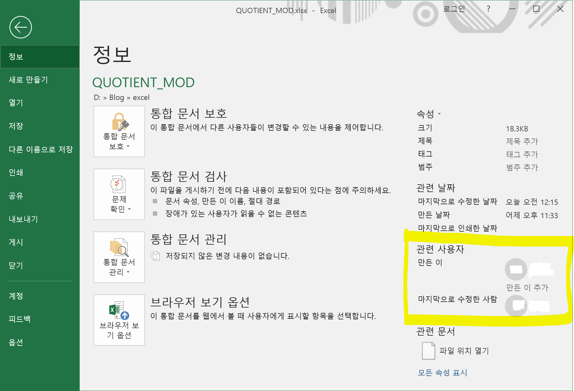 엑셀이나 파워포인트 문서를 만들고 동료에게 배포를 하다 보면 파일 정보에서 만든 사람과 마지막으로 수정한 사람에 대한 정보가 있다. 누가 만든 문서이고 누가 수정한 것인지 알 수 있기 때문에 저자에게 문의를 하거나 제안을 할 수 있어 편리한 점이다.
