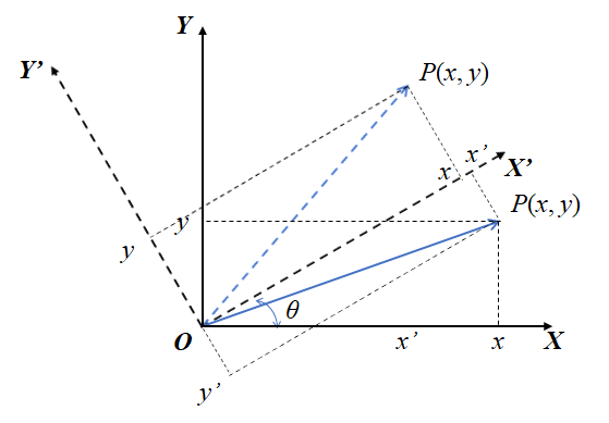그림 2는 그림 1에서 점 P는 그대로 두고 XY좌표계를 원점을 중심으로 $\theta$만큼 회전시킨 것이다. 점 P도 같이 회전되었다면 P' 위치에 있을 것이다.