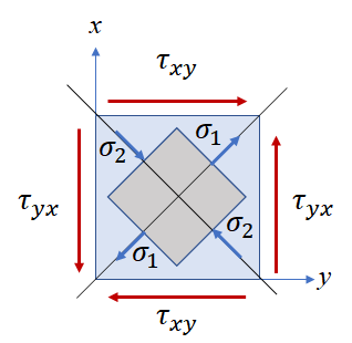 $$ \begin{bmatrix} \sigma_1 & 0 \\ 0 & \sigma_2 \end{bmatrix} = \begin{bmatrix} \tau_{xy} & 0 \\ 0 & -\tau_{xy} \end{bmatrix} $$